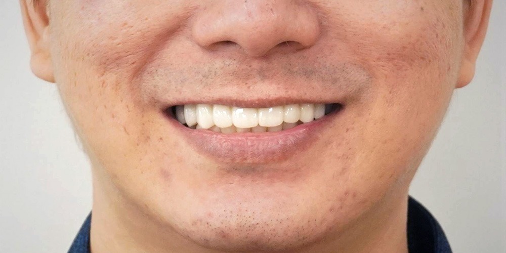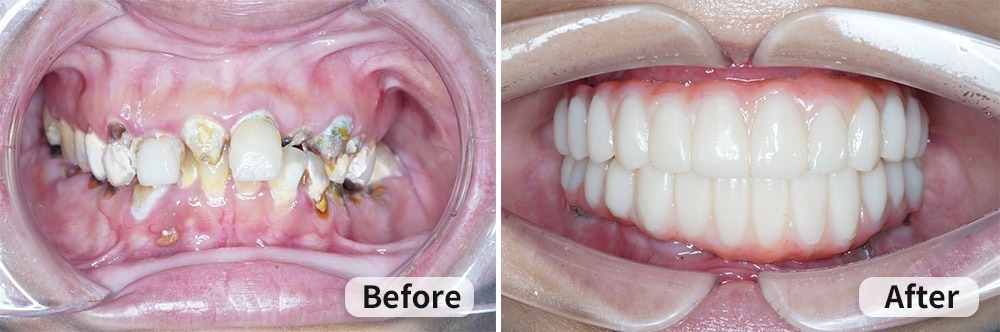 這位患者因有嚴重牙周病導致舊有假牙脫落,有急需恢復門面的需求。經過醫師與患者雙方溝通協調後,由補骨分階段的治療方式改成一日植牙療程。