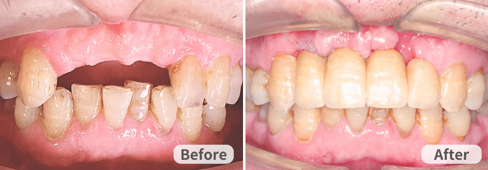 患者原本的側門牙牙齒已經嚴重斷裂,結構上也無法利用全瓷冠或是其他材質的假牙復形,所以我們把剩餘的牙根拔除,並開始評估植牙的可行性,也由於患者拔除牙根後立即著手準備植牙,骨質條件相對完整,診所利用X光及數位掃描設備規劃植牙的位置、角度,並搭配醫師專業技術,在短時間內就完成植牙手術,不僅外觀自然、恢復狀況也非常良好。